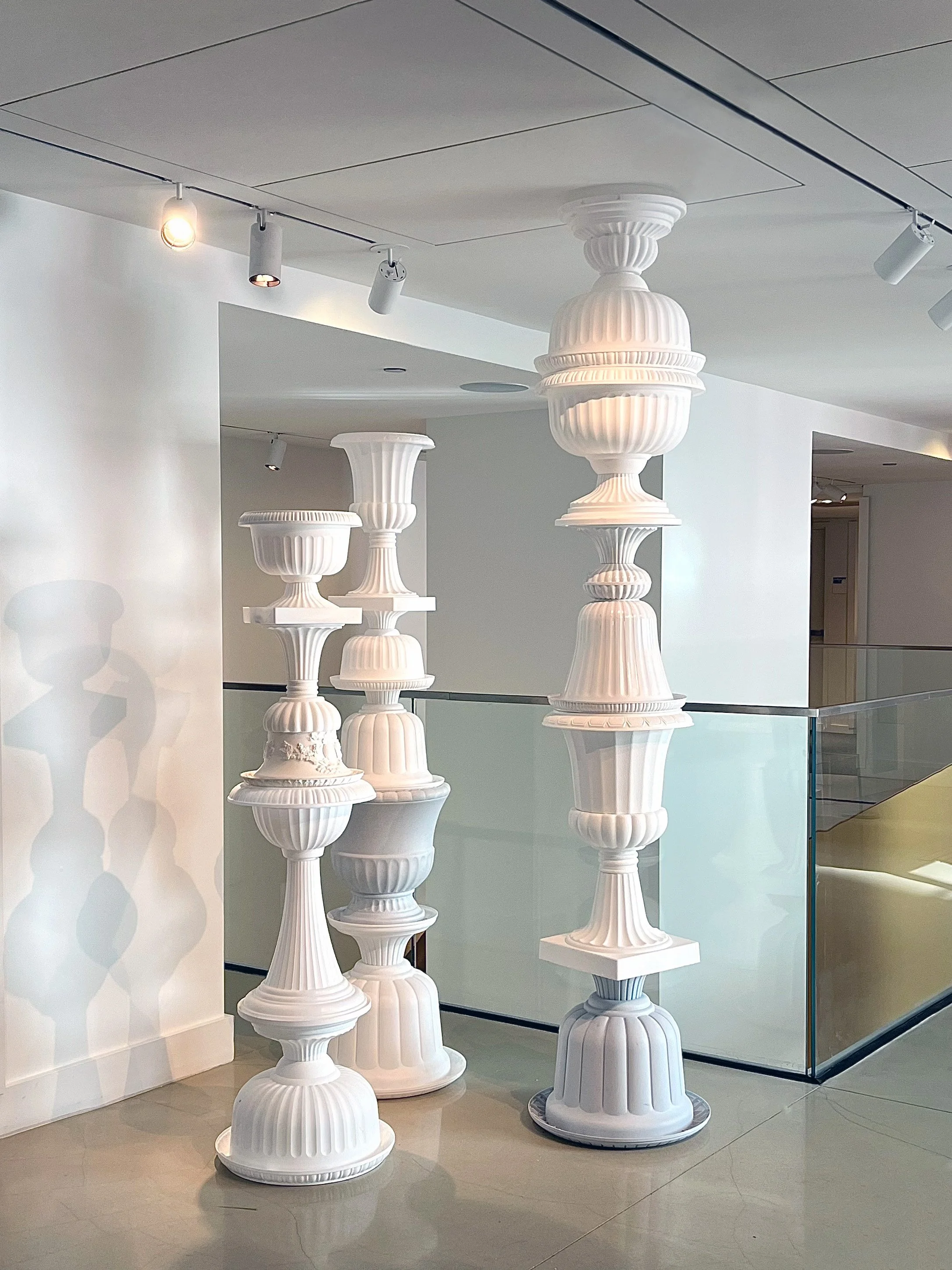 A view from home, 2022, site-specific installation at 21c Museum Hotel Chicago of found resin and plaster garden urns, steel, sandbags, 94in x 60in x 50in